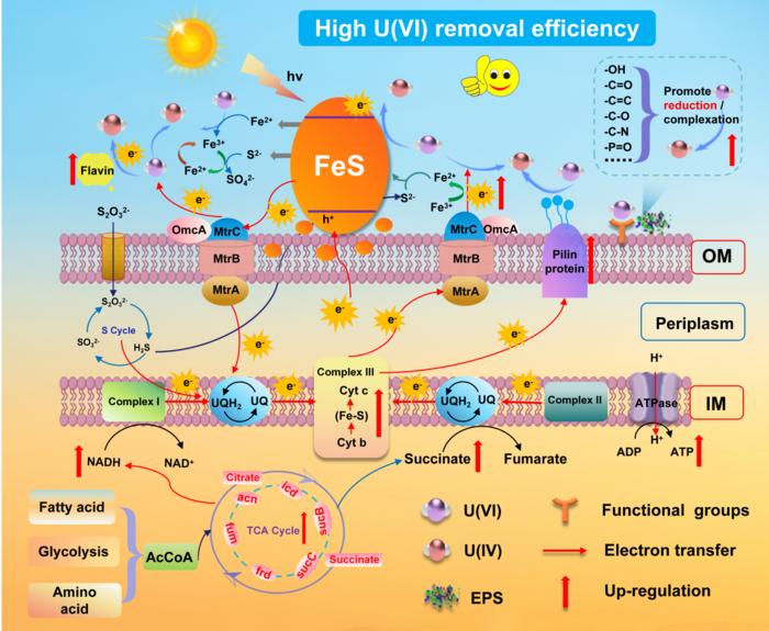 Под воздействием света эти крошечные минеральные частицы действуют как миниатюрные солнечные батареи. Они улавливают световую энергию и высвобождают фотоэлектроны, которые затем выполняют основную работу: лишают уран растворимости и превращают его в стабильный, неподвижный осадок, который больше не представляет непосредственной угрозы для окружающей среды. Система также создает трансмембранные электронные каналы, в которых фотоэлектроны стимулируют метаболическую активность бактерий, что, в свою очередь, способствует непрерывной регенерации активных минеральных участков. Это замкнутый самовосстанавливающийся цикл, который поддерживает активность биогибрида на протяжении всех этапов обработки.
